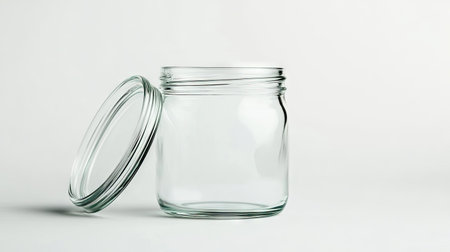 Transparent empty glass jar with open lid on a clean white background, minimal product photography for kitchen or storage concept