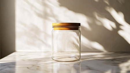Empty glass jar on a white marble table. Sunlit shadows create beautiful patterns. Ideal for product mockups or decorative displays.