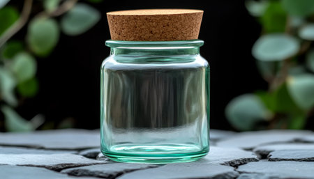 Empty Glass Jar with Thick Sustainable Cork Top, Minimal Decorative Texture, Copy Space for Graphics