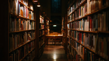 A grand library with tall, wooden bookshelves filled with books, dimly lit to create a vintage, quiet atmosphere. Perfect for themes of knowledge, history, and literature.