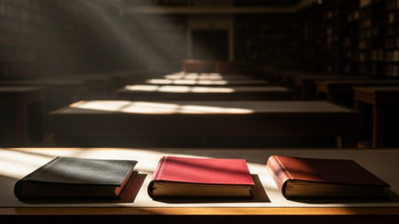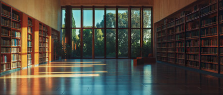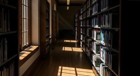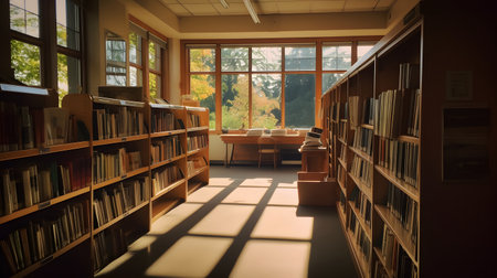 Explore an inviting library with rows of books bathed in sunlight, perfect for study, research, or adding a touch of intellectual charm to your projects