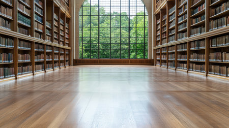 Spacious and serene library featuring empty bookshelves, inviting quiet study and research