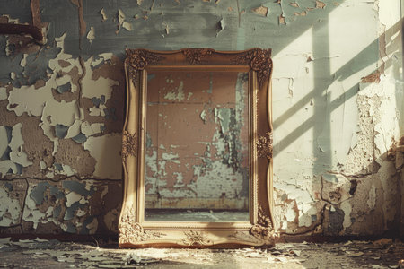 Ornate gilded baroque picture frame hanging on a distressed wall with peeling green paint. dramatic sunlight streams through a window, casting sharp shadows and highlighting the decay and vintage, abandoned atmosphere.