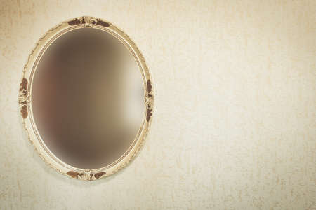 Antique vintage blurred mirror on wall with wallpaper, retro vintage design space for text