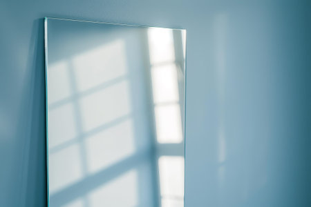A mirror is reflected in a window, creating a bright and sunny atmosphere. The mirror is made of glass and is placed on a wall