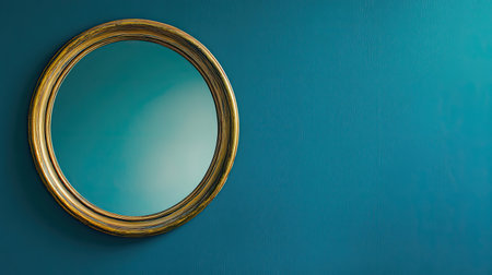 This image showcases a stylish round mirror with a golden frame set against a vibrant teal wall, ideal for home decor inspiration and interior design projects.
