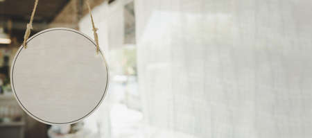 panoramic wide banner. blank vintage wooden sign board hanging on glass door in modern cafe restaurant, copy space for text advertising, advertisement marketing and small business owner concept