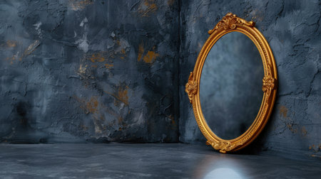 This stunning image features a vintage mirror with an intricately designed golden frame set against a textured dark blue wall, offering a striking contrast.