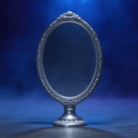 Ornate silver magic mirror on a blue background.