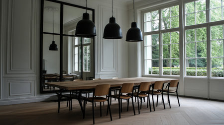 Modern living room with dining table and chairs in Amsterdam, white walls, wooden floorboards, large window on the right side of the photo showing a garden view, hanging black pendant lights above the modern rectangular mirror over a wooden dining table. Photo taken at midday with a Canon EOS camera, using natural light. --chaos 30 --ar 16:9 --v 6.1 Job ID: b799ba29-8e7d-4b14-8383-fec1f9aa92a8
