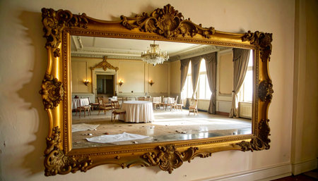 Wide shot, Ornate gold framed mirror reflecting deserted ballroom with crystal tables, dust sheets draped over chairs, single spotlight beam, hauntingly elegant decay