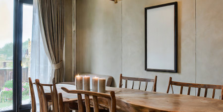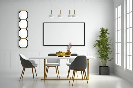 White wall with an empty frame on it depicts the interior of a dining room with a wood table, pendant lights, grey chairs, and a rug on the tiled floor. a modern hotel and residential design idea