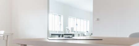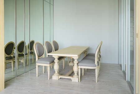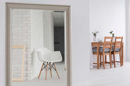 Interior of modern flat, Living room with white table, mirror
