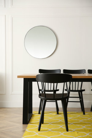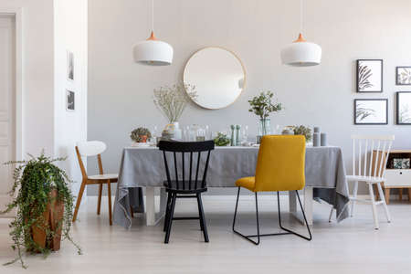 Black and yellow chair at table in white dining room interior with plants, lamps and mirror. Real photo