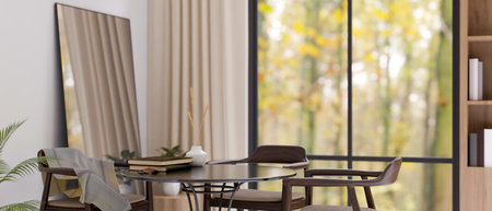 Minimalist restaurant dining area with round mirror and houseplants in natural light. Modern dining table with sunlight, a round mirror, and minimalistic houseplants. Modern cafe interior.