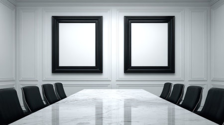 A conference room features a long marble table surrounded by black chairs. Two empty framed pictures hang on the white paneled wall. The composition displays a clean, minimalist style with bright overhead lighting. The scene suggests a professional environment, suitable for various business publications and related commercial applications.