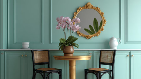Explore a beautifully designed dining space featuring mint green walls, a decorative mirror, and a charming orchid centerpiece on a round table, perfect for home inspiration.
