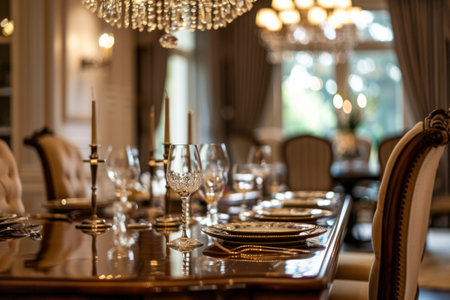A table with plates and glasses on it in a room, AI