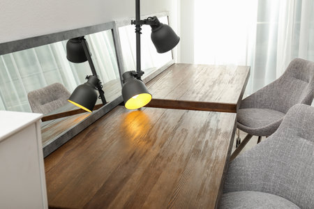 Empty dressing tables with mirrors in makeup room