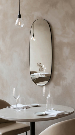Minimalist restaurant dining area with mirror in light colors in natural light. Modern dining table with sunlight, a rounded mirror, and minimalistic houseplants. Modern cafe interior.