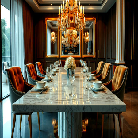 Elegant dining room interior with a polished wooden table.