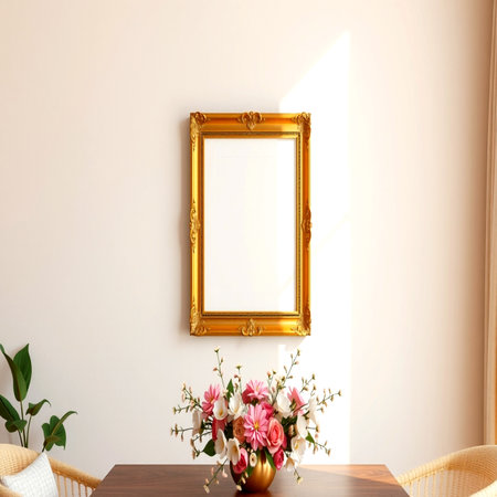 3d render of interior with golden frame and flowers on the table