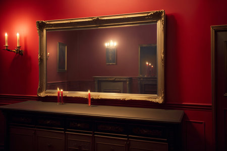 the reflection in the mirror above the table captures a mesmerizing scene in the room. shot with the hasselblad hc 100mm f22 lens, the image showcases a captivating blend of dark green and dark gray tones. the artistic influence of ssaku hanga is evident, while the uhd quality brings out every intricate detail. the play of volumetric lighting adds depth, complementing the industrial and product