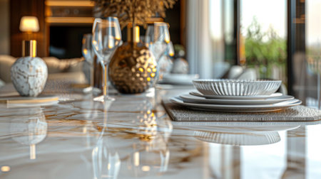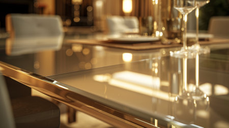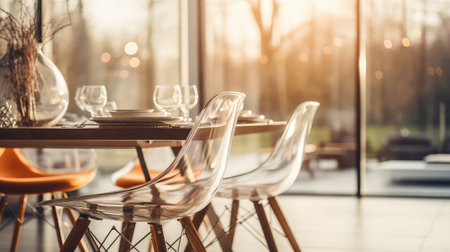 art deco dining room with sleek and minimalist furniture, silverware, and glassware, created with generative ai