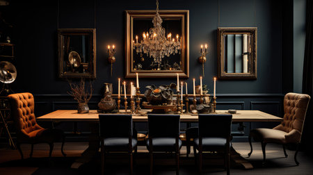 Elegant dining room with dark green walls and wood table