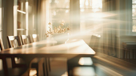 A wooden dining table surrounded by chairs bathed in natural light, creating a cozy and inviting atmosphere. Perfect for family gatherings and everyday meals.