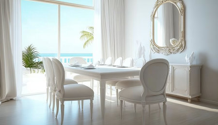 Bright Coastal Dining Area Featuring White Walls, Marble Floors, and a Golden Decorative Mirror