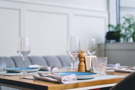 Close up of wood desk with wineglasses, plates, forks, napkins and glasses in restaurant