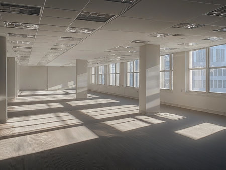 A bright, empty office with large windows, white walls, and simple furniture. Sunlight illuminates the space, creating a serene atmosphere.