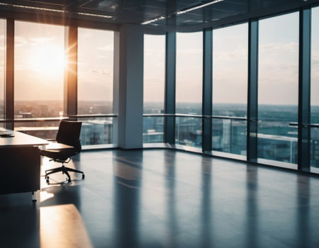 Abstract blurred interior light modern interior with panoramic windows and beautiful lighting in sunset interior workplace business
