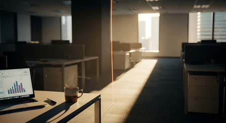 A contemporary office environment with a laptop displaying charts, a coffee cup, and large windows allowing natural light.