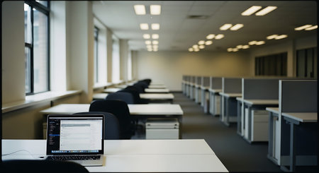 A spacious, empty office with rows of cubicles, a laptop on a desk near large windows, and bright natural light.