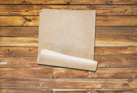 Ancient scroll rolled out of beige paper, tied with a rope on a brown background.
