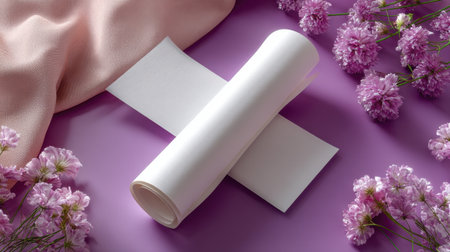 This image features a neatly arranged white paper roll on a soft pink fabric, complemented by fresh flowers and set against a vibrant purple backdrop, creating an elegant and inviting scene.