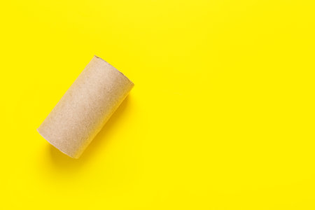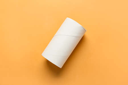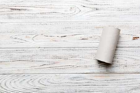 Empty toilet paper roll on colored background. Recyclable paper tube with metal plug end made of kraft paper or cardboard.