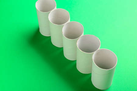 Flat lay composition with empty toilet paper rolls and space for text on color background. Recyclable paper tube with metal plug end made of kraft paper or cardboard.