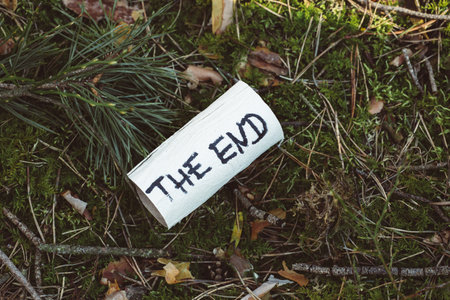 A finished toilet paper roll with The end note on the grass - Panic because of the coronavirus concept