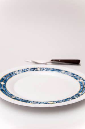 An empty white plate on a blue background. Clean dishes for Breakfast, dinner or lunch. Kitchen items. A top view of a flat layout