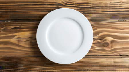 Plain white plate on a wooden background, top view. Great for food presentation or text overlay.