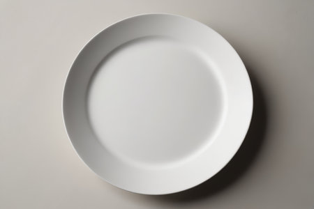 A simple white plate rests on a textured gray surface, embodying minimalism and elegance. Ideal for showcasing culinary creations and enhancing dining settings.
