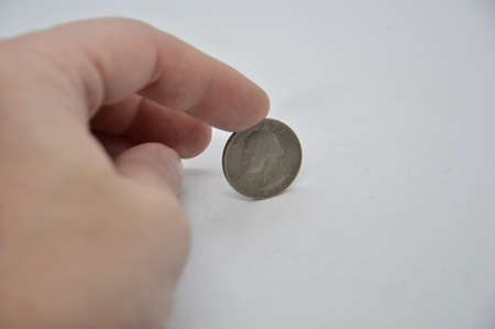photographed close-up of a quarter of the US dollar in the hands of a man, defocused