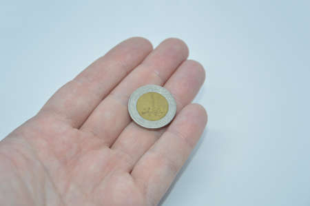 Man holding one small polish coin in hand. Money from poland. Polish currency.
