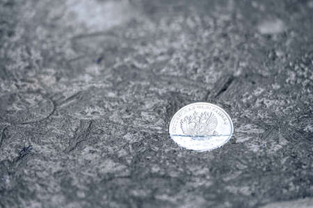 An old quarter dollar coin in the snow. The lost 25 cent coin. Antique money issued in 1971. Soft focus, copy space