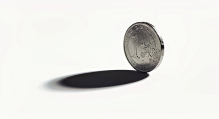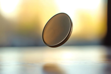 Gold coin spinning on its edge against a blurred background, representing financial uncertainty, chance, and decision making