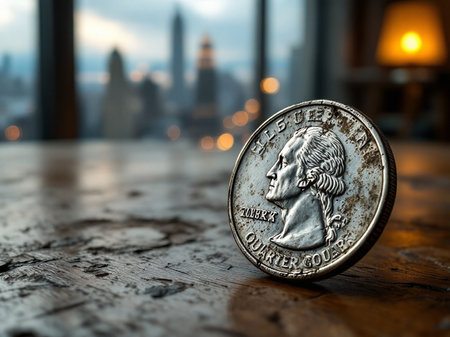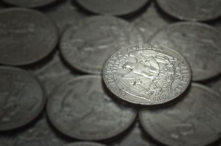 A stack of coins with the top one being a quarter. The coins are stacked on top of each other