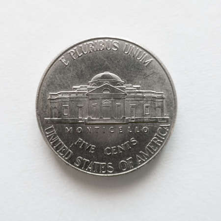 Metal money or coin isolated on white background, currency or monet of United States of America, american five cents reverse.